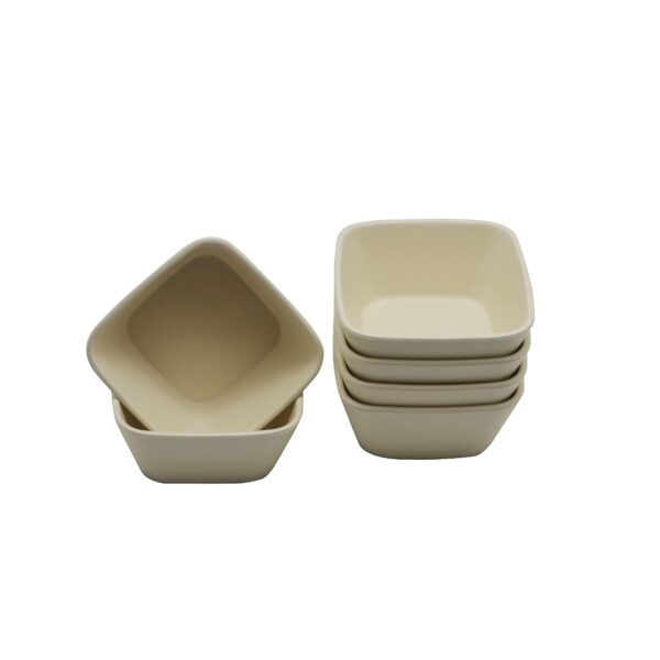 Eco-friendly 4″ Square (200 ml) bamboo fibre bowls, packaged as a set of 6.